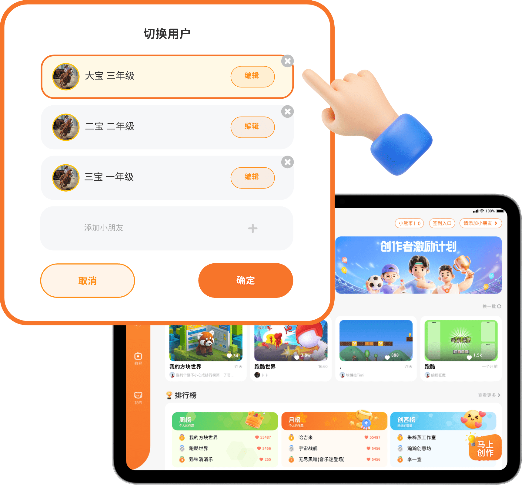 打造专属编程团体社群,孩子们可加入团体,点赞优秀的编程作品,培养团队精神。